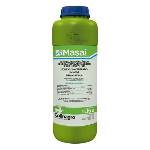 BIOESTIMULANTE MASAI es la mezcla de dos productos orgánicos 100%: Proteína Hidrolizada y Extracto de Algas Marinas. La Proteína Hidrolizada provee todos los Aminoácidos esenciales y Nitrógeno todo de origen orgánico para la planta. El extracto deshidratado de Algas Marinas (Ascophyllum nodosum) aporta también Proteína cruda (Aminoácidos), Carbohidratos, Ácido Algínico, Manitol, Carotenos y Citoquininas (Hormonas orgánicas naturales), además trazas de los elementos mayores, secundarios y trazas de menores (Cu, Fe, Mn, Zn, B y Mo). Se debe aplicar de forma foliar.