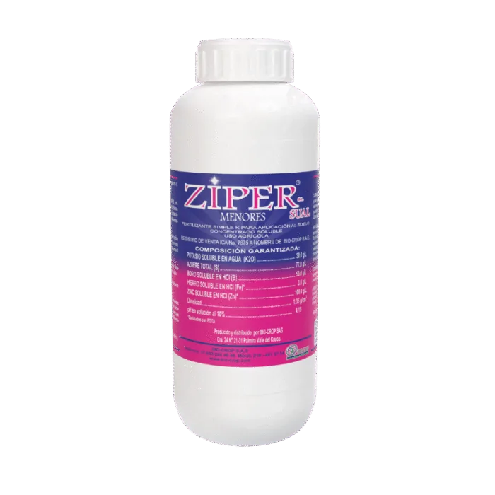 alto. El Potasio, Azufre, Boro, Hierro y Zinc presentes en ZIPER®SUAL SL son esenciales para varios procesos fisiológicos de las plantas, como la regulación osmótica, la fotosíntesis, la formación de proteínas, la síntesis de clorofila y la resistencia a enfermedades. Estos micronutrientes son fundamentales para mejorar la calidad y cantidad de las cosechas, optimizando el rendimiento de los cultivos y favoreciendo una cosecha más saludable y abundante.