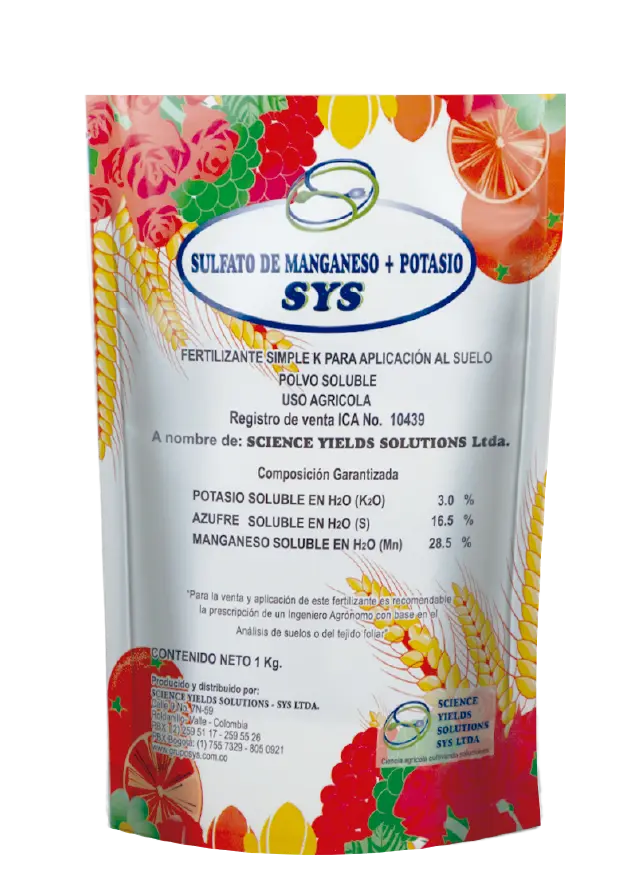 SULFATO DE MANGANESO + POTASIO SYS es un fertilizante en polvo que posee un equilibrio adecuado de nutrientes S, Mn, y K, fácilmente disponibles para las plantas. El manganeso (Mn) es un micronutriente importante para las plantas y, después del hierro, es el que las plantas requieren en mayor cantidad. Al igual que sucede con cualquier otro elemento, su deficiencia o su toxicidad pueden representar una limitante para el desarrollo de las plantas. En varias formas se asemeja al hierro, por lo que su deficiencia o su toxicidad suelen ser confundidas con las de éste. El Manganeso interviene en varios procesos biológicos incluyendo la fotosíntesis, la respiración y la asimilación de nitrógeno. También interviene en la germinación del polen, el crecimiento del tubo polínico, el alargamiento celular en la raíz y la resistencia a patógenos.