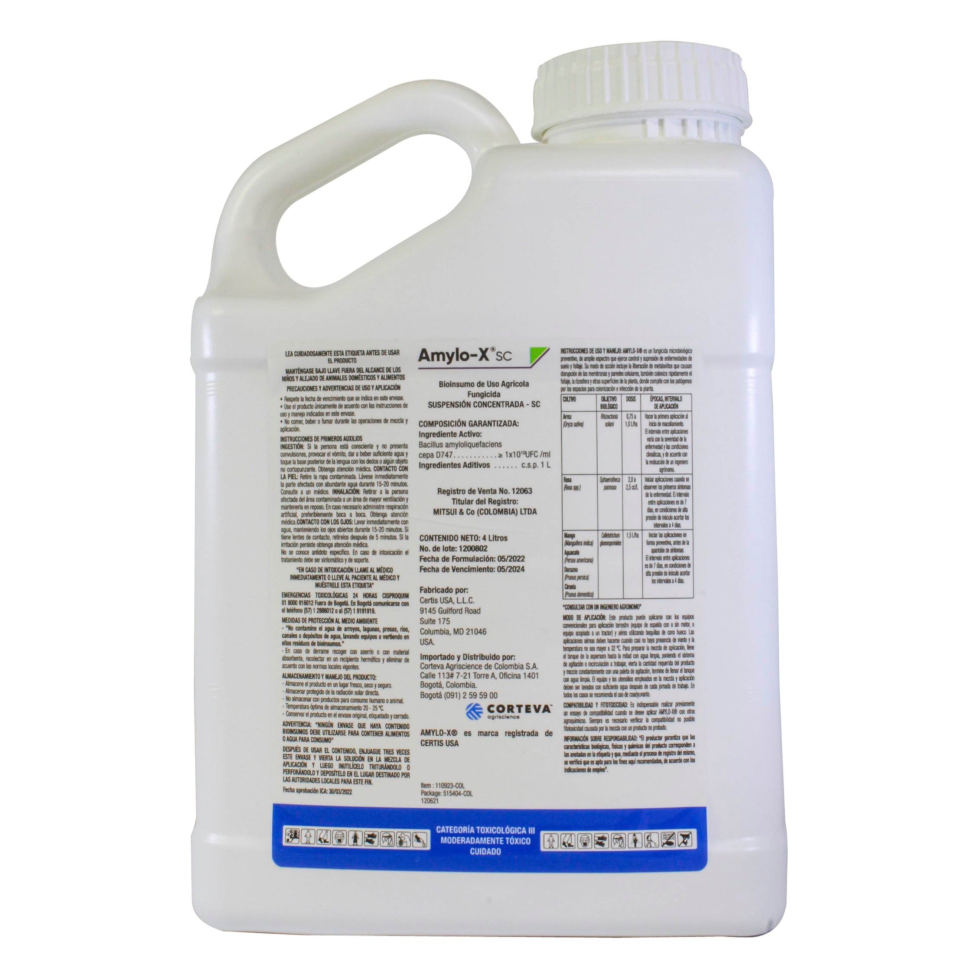 Fungicida biológico Amylo-X SC basado en Bacillus amyloliquefaciens con concentración de 1x10¹⁰ UFC/ml. Controla Antracnosis en aguacate y frutales, Mildeo polvoso en rosas y Rhizoctonia en arroz. Ideal para rotación en programas de manejo integrado de enfermedades.