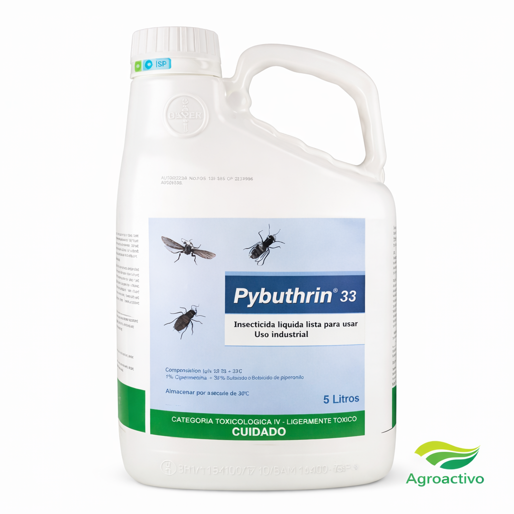 PYBUTHRIN 33. Formulación insecticida de origen natural basada en piretrinas extraídas del Crisantemo, presentada como emulsión lista para aplicar. Cada lote cuenta con certificación individual que asegura la calidad y minimiza riesgos de contaminación en productos terminados. Proporciona un efecto de derribo inmediato sobre insectos, combinado con acción letal y propiedades repelentes que garantizan control efectivo de plagas en aplicaciones agrícolas e industriales.