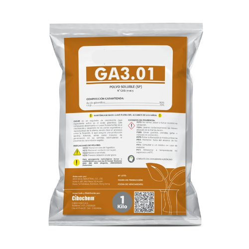 GA3.01 es un regulador de crecimiento cuyo ingrediente activo es el ácido giberélico, el cual tiene un rol importante en el crecimiento y desarrollo de las partes vegetativas y reproductivas de la planta. Es de suma importancia en procesos como la floración, para así, asegurar una excelente producción. También es un inductor de germinación en las semillas, estimulando el crecimiento del embrión vegetal.
